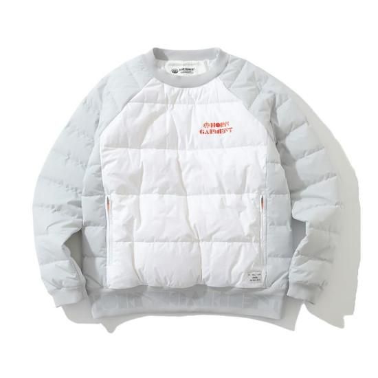 落ち着いたトーナルカラーブロッキングパターンのダウンプルオーバー。