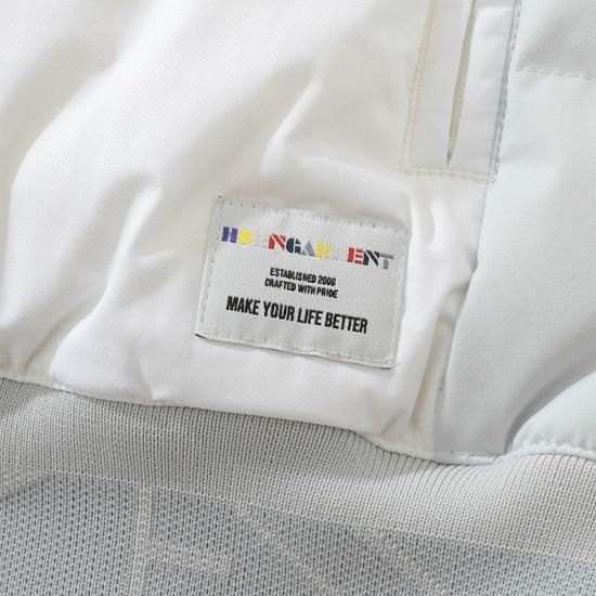 脇ポケットにロゴ入りファスナー、左裾にMID CENTURY風ロゴのネーム、胸にブロックロゴ刺繍をあしらいました。