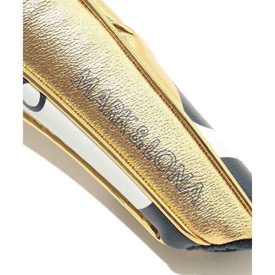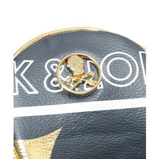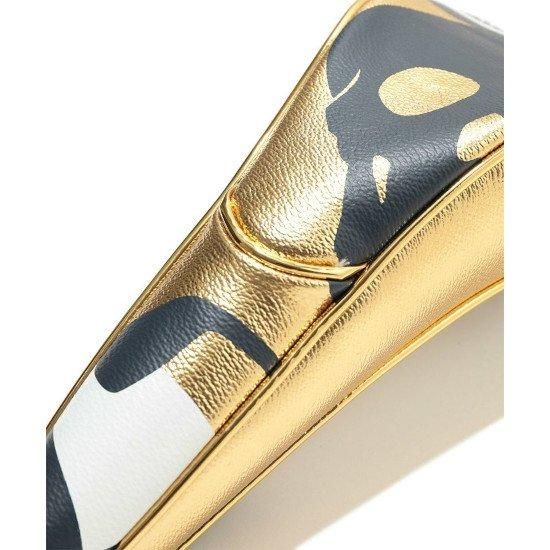 細かくシボの入ったメタリックなシンセティックレザーに、鮮やかなカラーリングの大柄プリントを施し、ステッチで凹凸を表現。