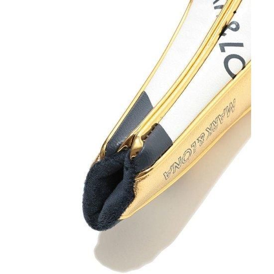 コンビネーションの生地には鏡面エナメルのメタリックシンセティックレザーを使用。