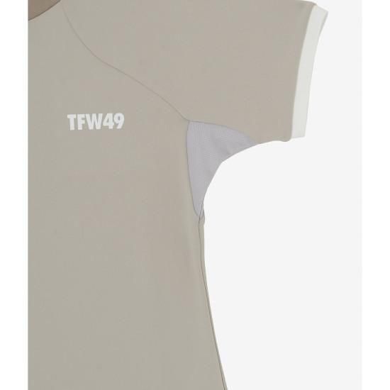 スポーティなシルエットながら、首元の配色デザインが華やかさをプラスし、洗練された印象に仕上げています。